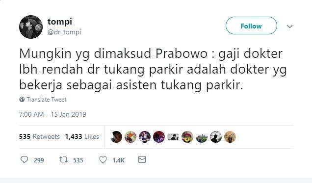 Sekarang banyak dokter kita gajinya lebih kecil dari tukang jaga parkir mobil, kata prabowo subianto kala itu. Sekarang banyak dokter kita gajinya lebih kecil dari tukang jaga parkir mobil, kata prabowo. Buat rmo puskesmas dan daerah iya sih pak. Sekarang banyak dokter kita gajinya lebih kecil dari tukang jaga parkir mobil, sebut prabowo di jcc senayan, jakarta, senin (14/1/19) malam, dalam pidato yang diberi judul indonesia menang tersebut. Benarkah gaji dari profesi elite seperti dokter kalah dengan tukang parkir? Nanti rumah sakit puskemas klinik kosong jadi tukang parkir semua. Beragam profesi yang dianggap vital dan perlu perhatian negara, kata prabowo, ialah jaksa, hakim, anggota kepolisian dan tentara nasional indonesia. Prabowo disoraki pendukung karena sebut nama megawati dan jokowi. Tompi bahkan menyebut bahwa gaji tenaga medis lebih rendah dari tukang cukur! Prabowo berjanji, ia dan calon wakil presiden sandiaga uno akan memperbaiki keadaan ini jika nantinya memenangi pilpres 2019. Untuk itu, ke depannya ia ingin memastikan bahwa dokter juga akan mendapatkan penghasilan yang layak. Prabowo sebut gaji dokter lebih kecil dari tukang parkir warganet bener ada juga yang jualan paka. Gaji tukang parkir pesawat minimalnya antara rp 5.000.000 sampai 6 juta per bulannya untuk indonesia.